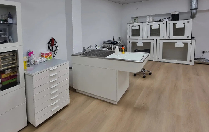 En esta amplia sala no es solo donde preparamos a nuestros pacientes para las intervenciones quirúrgicas, también realizamos curas o higienes dentales. Disponemos de dos zonas de hospitalización debidamente separadas para poder ingresar a perros y gatos minimizando todo lo posible su stress.